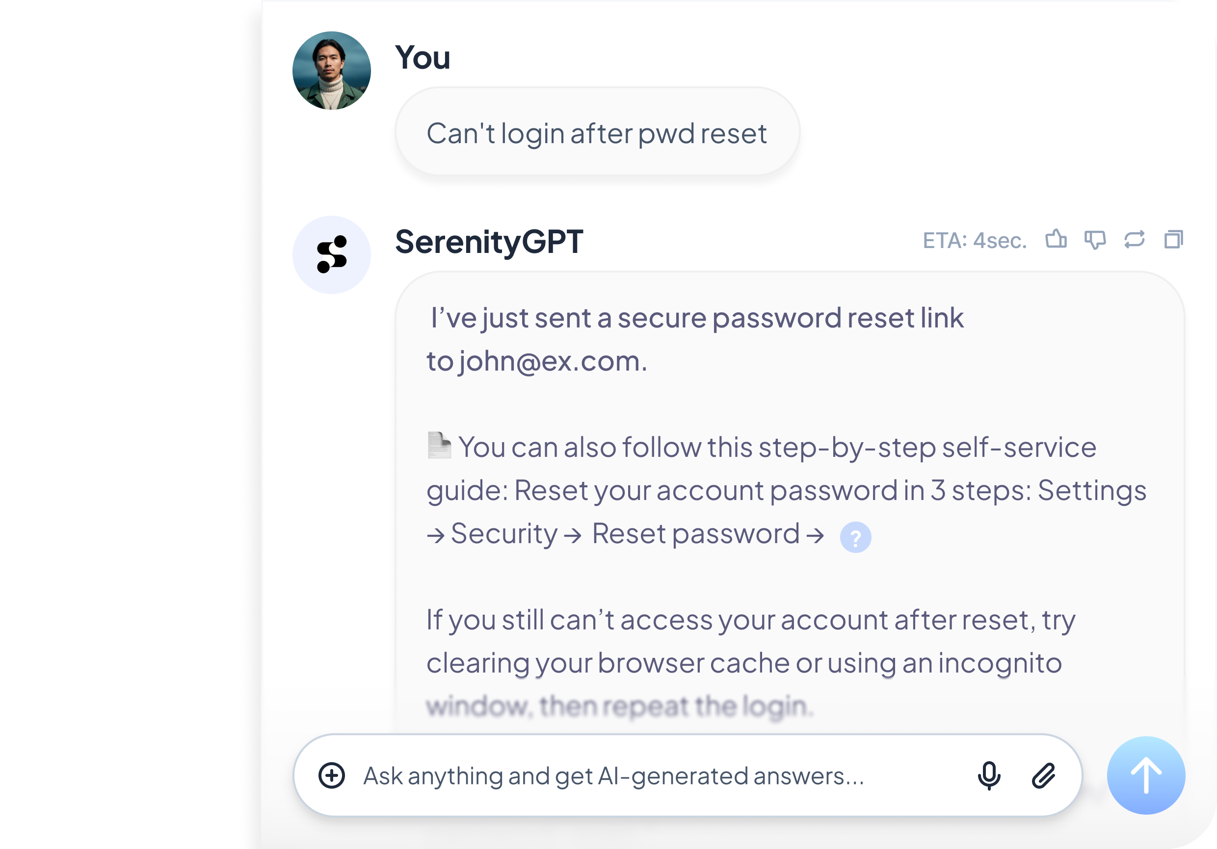 SerenityGPT helps support teams deliver fast, accurate answers and run repeatable workflows, grounded in your approved knowledge and ticket history. Customers get reliable self-service. Agents get confident assistance. Leaders get visibility into what drives volume and friction.